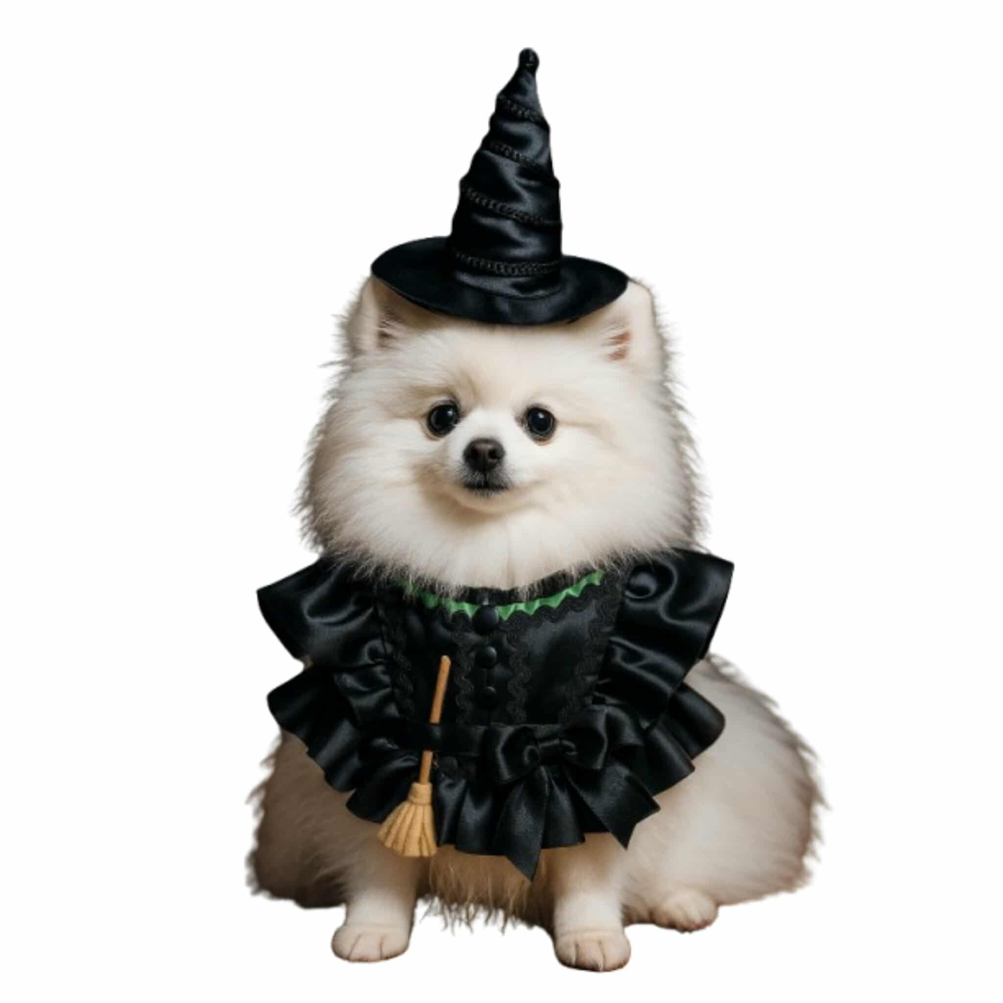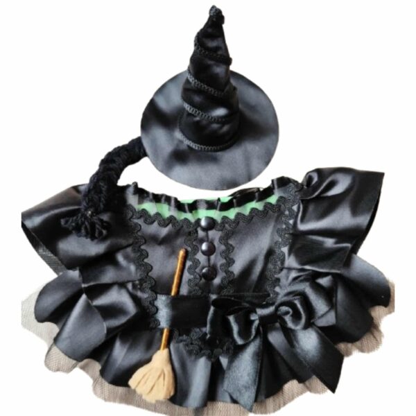 Confeccionado em cetim preto, com forro de TNT, feltro, vassoura, botôes, fitas pra amarrar, acompanha chapéu com trança e elástico de pescoço ajustável.