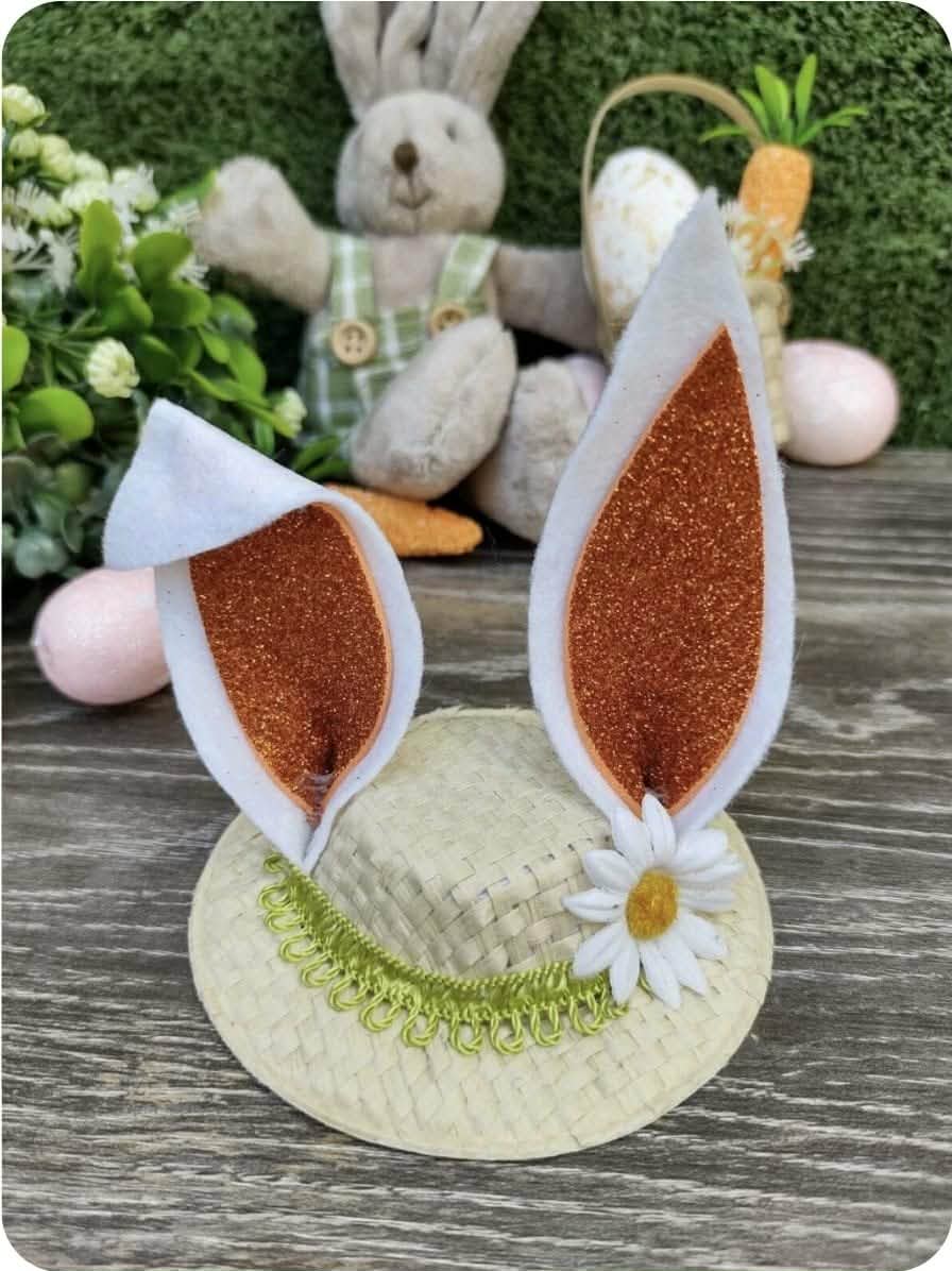 Chapéu: Tamanho: 9cm. Chapéu de palha e orelhas e feltro e eva. Fita para amarrar 30cm de cada lado + 2 elásticos para cada lado.